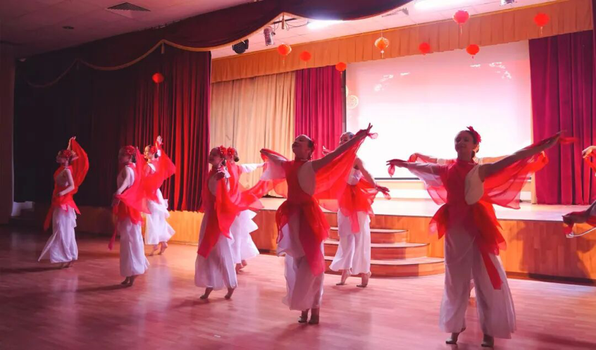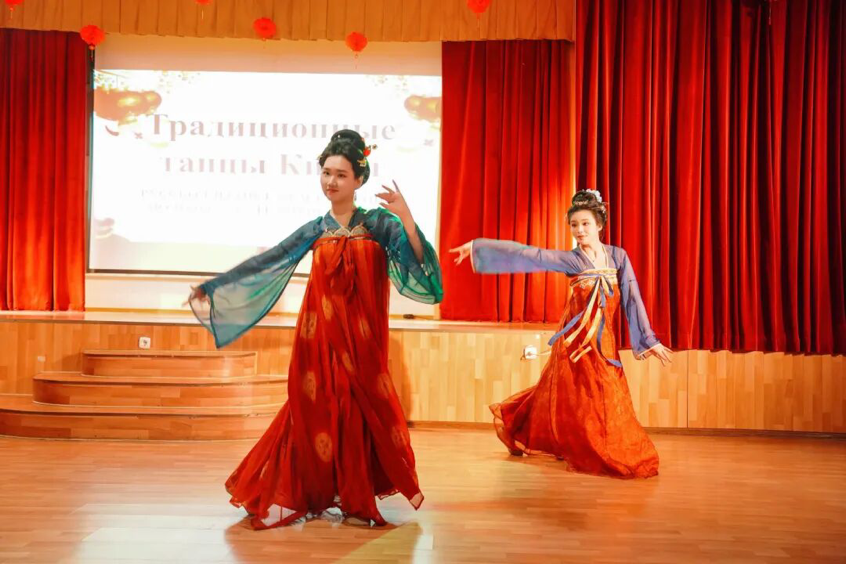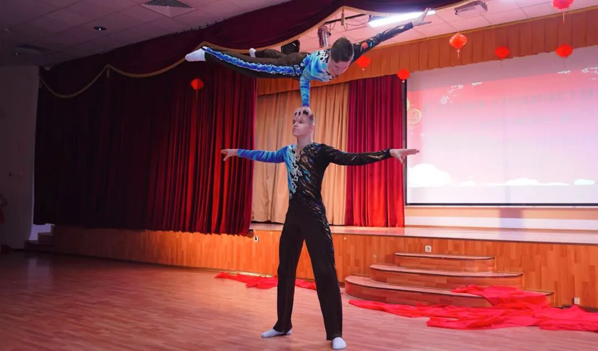 在活动中,中国春节文化通过生动的视频与讲解传达了其独特魅力。两国青年携手演绎精彩节目,张浩东和张艺璇深情演唱的《我和我的祖国》、葛琪、李沁洁、李若彤、林腾、彭晨晨带来的古典舞《清平乐》等作品,展示了中华文化的博大精深;而俄罗斯学生们呈现的杂技与体操表演则巧妙地将力与美结合,令观众为之赞叹。